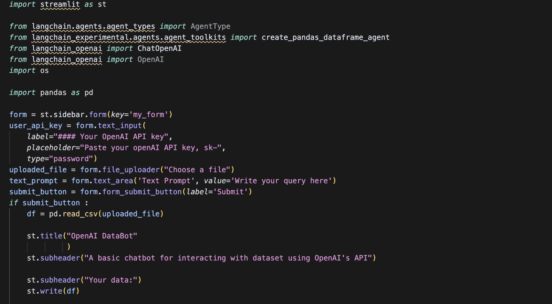 By leveraging LangChain's agent framework, DataBot doesn't just return predefined analyses but actively reasons about the user's intent and generates appropriate code to answer their specific questions. This creates a powerful, flexible tool that can adapt to various datasets and query types without requiring reprogramming.